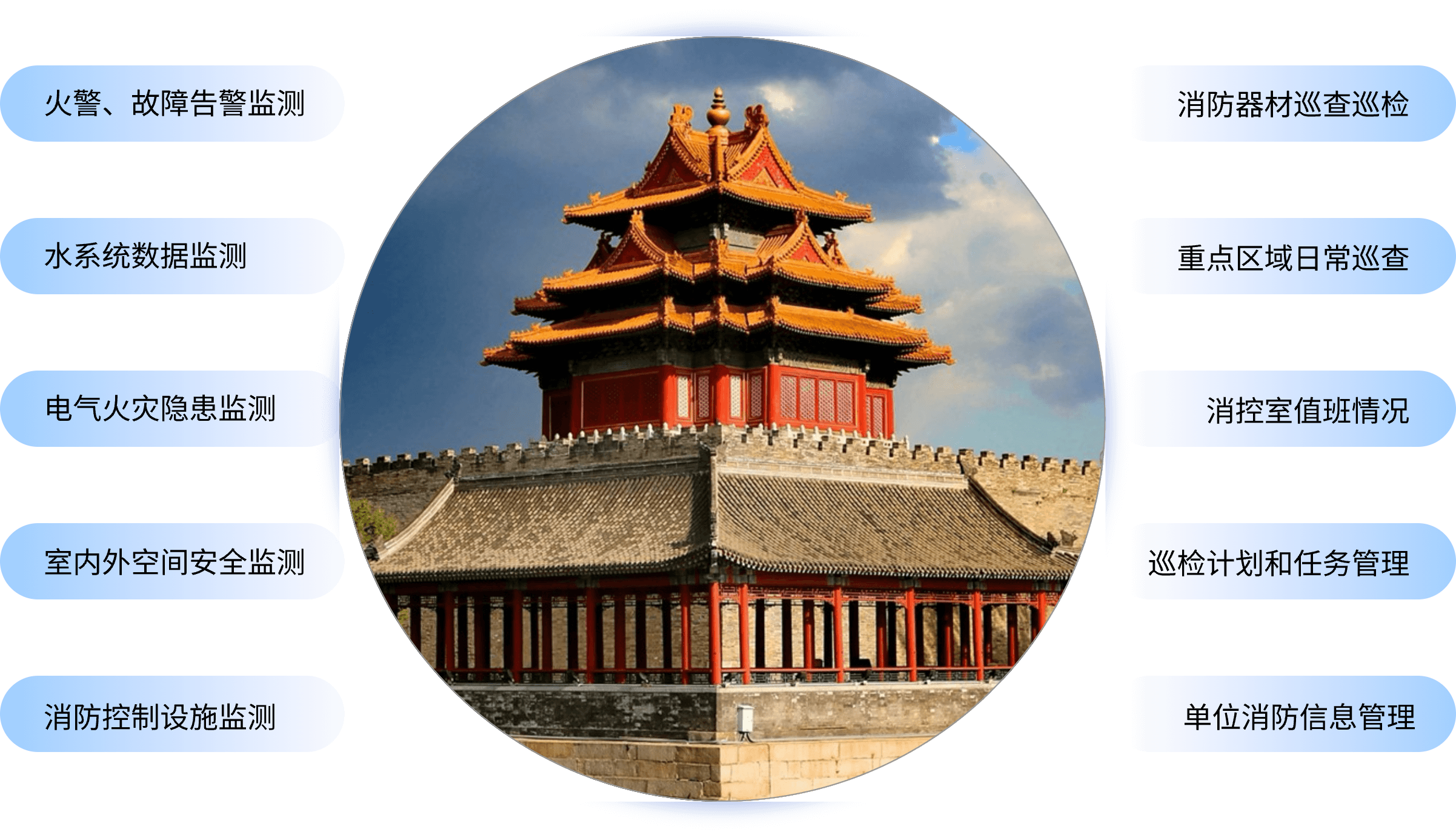智慧消防系统通过物联网、大数据、云计算等现代信息技术,实现对古建筑火灾的实时监测、预警和报警。通过部署智慧用电探测器、智慧烟感、气体探测器等硬件终端,可以实时监控古建筑的整体环境,云平台对消防数据进行智能监测分析,能够及时发现并处理火灾隐患,实现火灾的早期预警和快速响应,此外,智慧消防系统还能够通过移动端捕获消防安全相关的各类巡查检查、值守、隐患整改等工作过程和结果,实现信息“一网统管”,提高火灾防范能力,有效降低火灾风险,防止因火灾造成的文物损坏,从而保护这些宝贵的文化遗产。